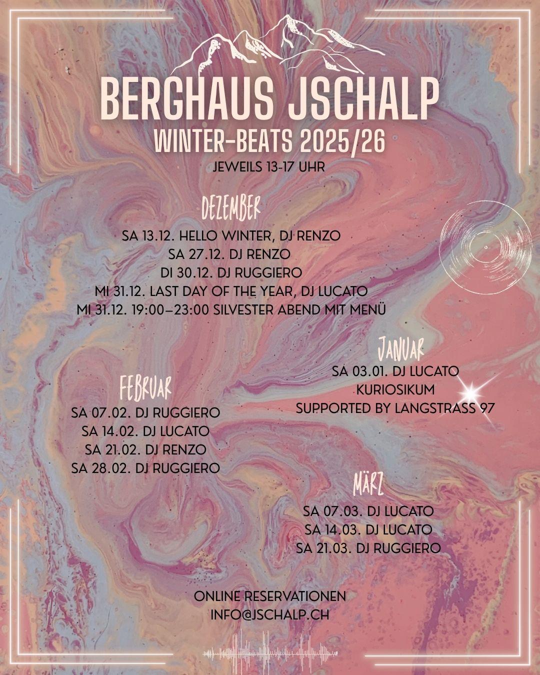 Jeden Samstag im Winter haben wir einen Day-Rave mit DJ auf der Sonnenterrasse, bei schlechtem Wetter sind wir im Indoor-Stübli.